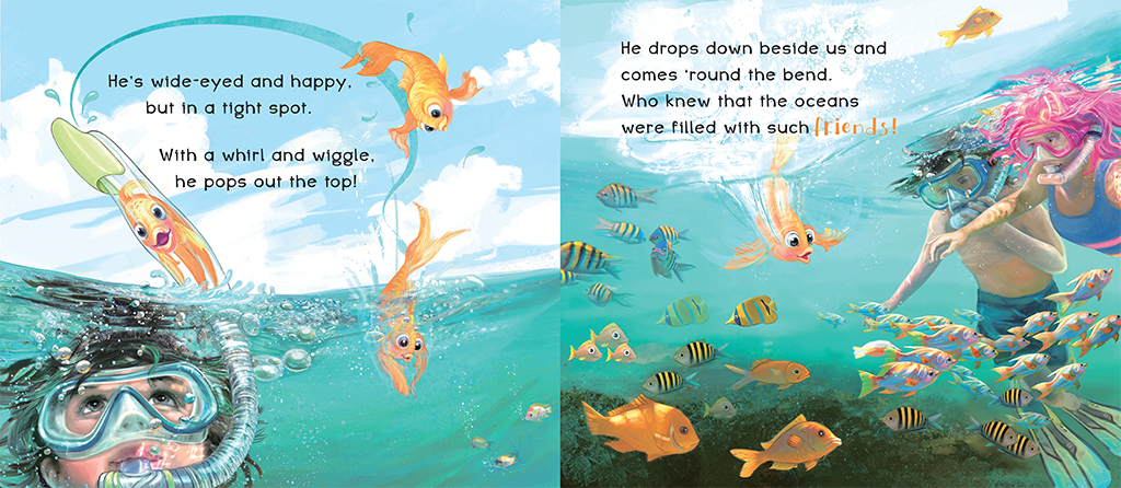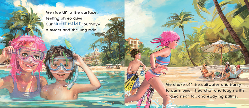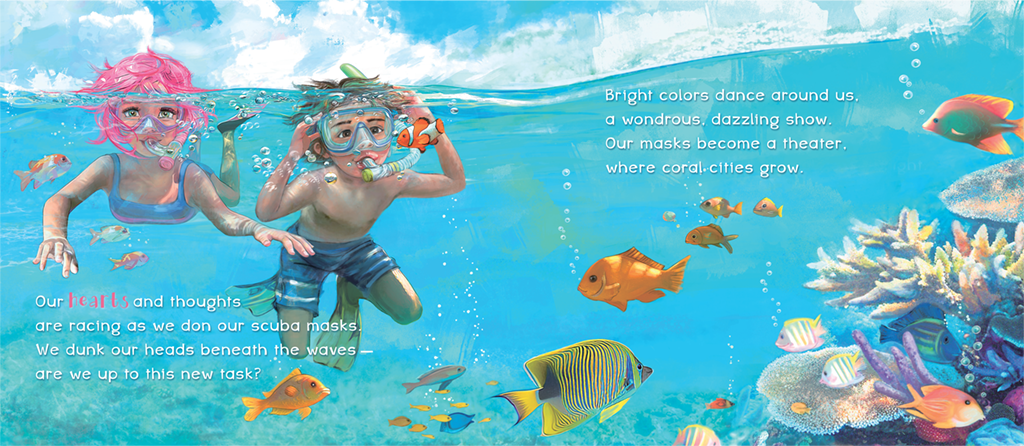 There, they dive into the crystal-clear ocean for their very first snorkeling adventure discovering a dazzling underwater world filled with colorful and playful saltwater fish.